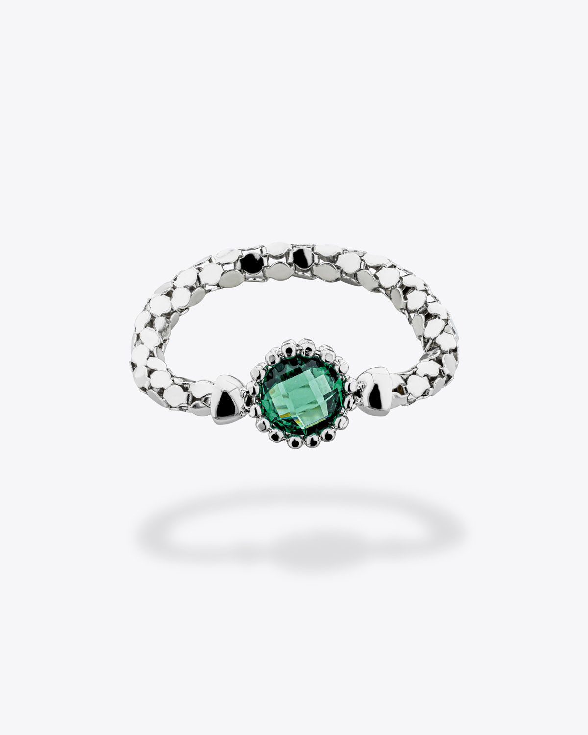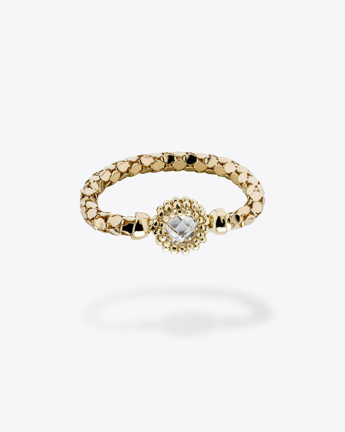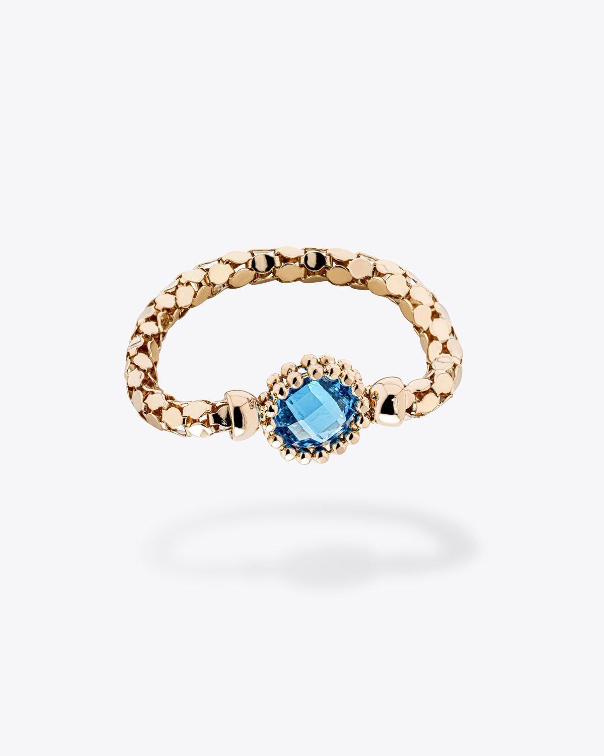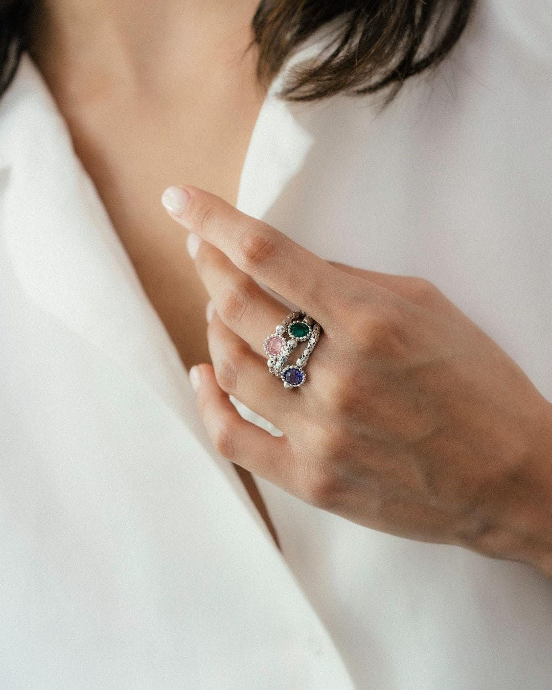 The Bella Ring is crafted from 18K gold combined with zirconia stones. It is available in a variety of stone colors and gold finishes. You can choose from two models: Bella Ring with Center Stone and Bella Ring with Dangling Stone.