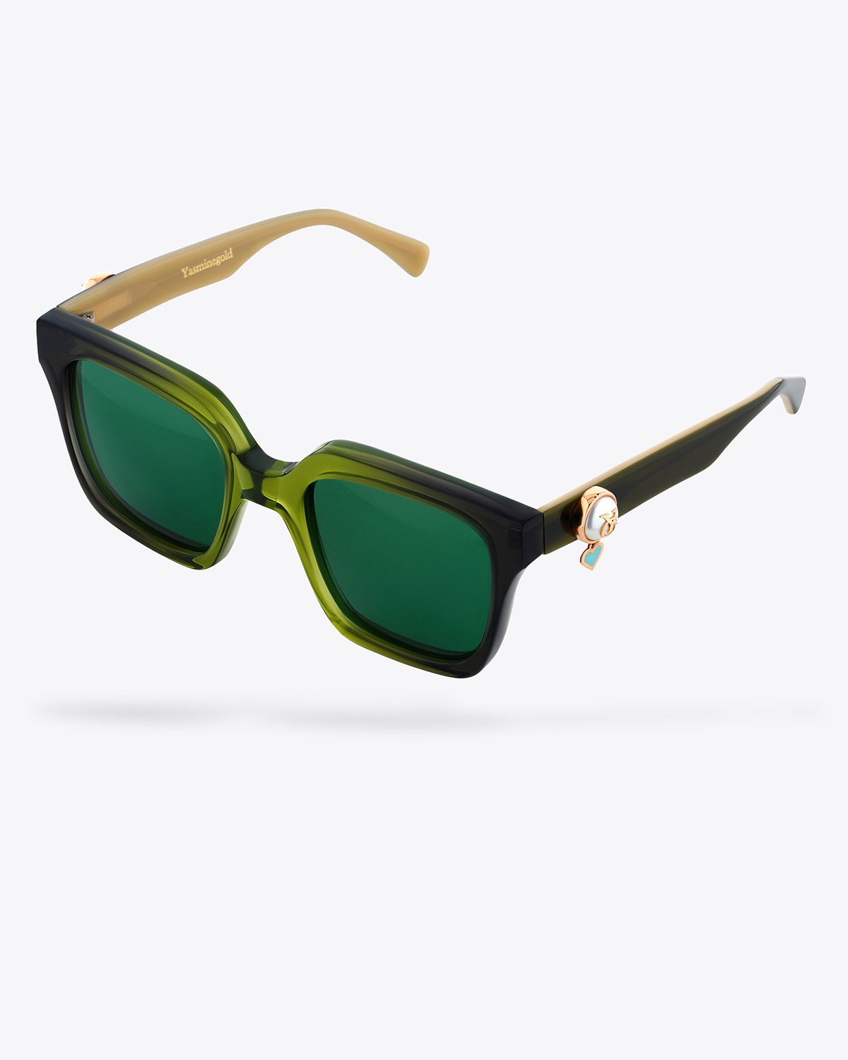 All Yasmin Gold eyewear features a signature 18K gold logo, with the gold weight laser-engraved inside the frame. In this model, both temples are adorned with natural pearls, paired with a small turquoise enamel heart, adding a delicate and artistic touch.