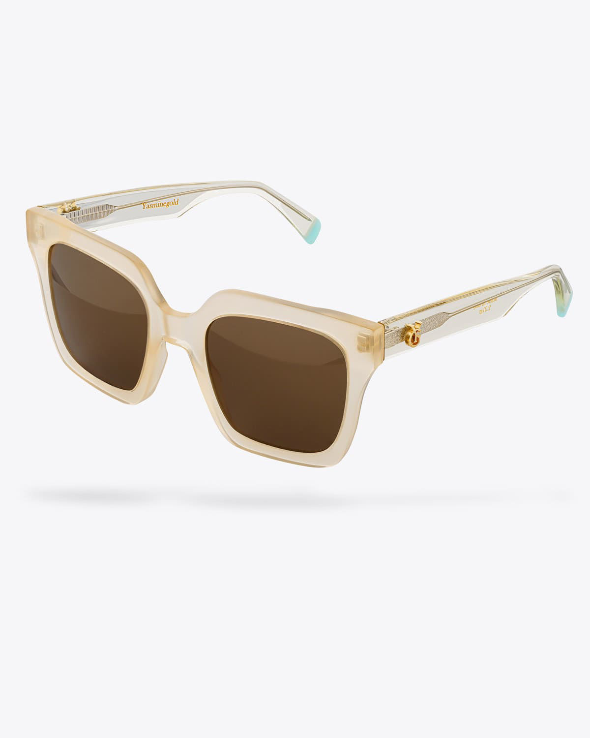 All Yasmin Gold eyewear features a signature 18K gold logo, with the gold weight laser-engraved inside the frame. In this special model, one temple is adorned with the YG gold logo, while the other features a heart design — a unique blend of brand identity and emotional elegance.